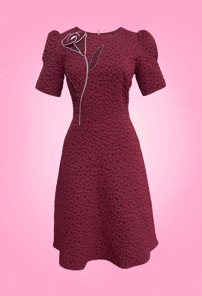 MÔ TẢ SẢN PHẨM: Đầm cổ tròn dáng ôm tùng xoè chữ A, cổ được thiết kế cân đối kín đáo, hoạ tiết hoa ẩn được thực hiện vẽ tay thủ công tỉ mỉ kết hợp hoa vải cầu kì, tay ngắn đỉnh tay nhún làm cho đôi thon gọn hơn, cửa tay ôm vừa vặn.