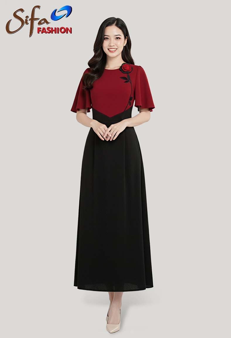 MÔ TẢ SẢN PHẨM: Đầm cổ tròn tay cánh tiên, rã phối eo, đính hoa 3D nghệ thuật.