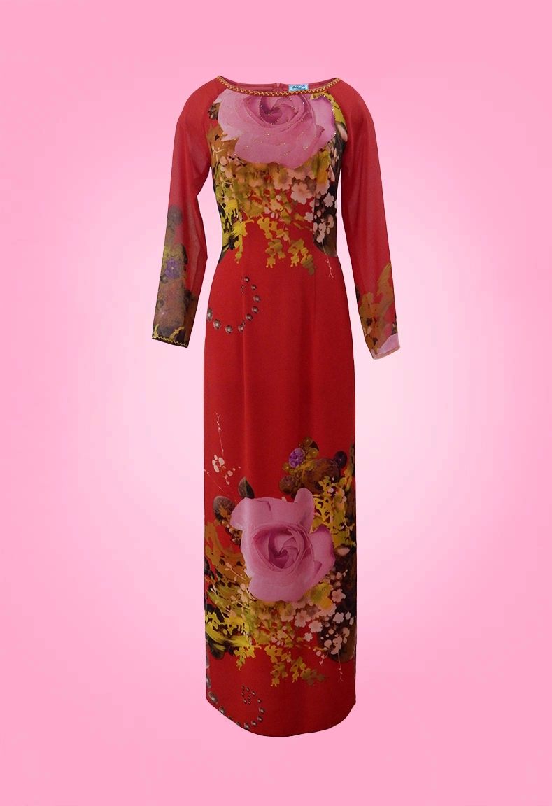 MÔ TẢ SẢN PHẨM: Áo dài cổ tim viền phối, vấn hoa tay thủ công.