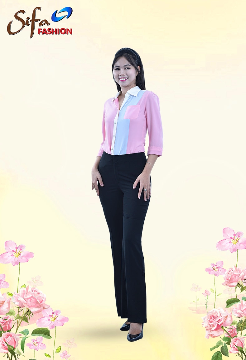 MÔ TẢ SẢN PHẨM: Áo cổ sơ mi với bảng phối 3 sắc hồng trắng xanh đầy năng động, trẻ trung. Kỹ thuật chiết ben tạo dáng áo chuẩn. Đỉnh tay nhún làm cho đôi vai thon gọn, cửa tay lơ vê. Bo lai được thiết kế bản lớn cân đối chiều dài áo.