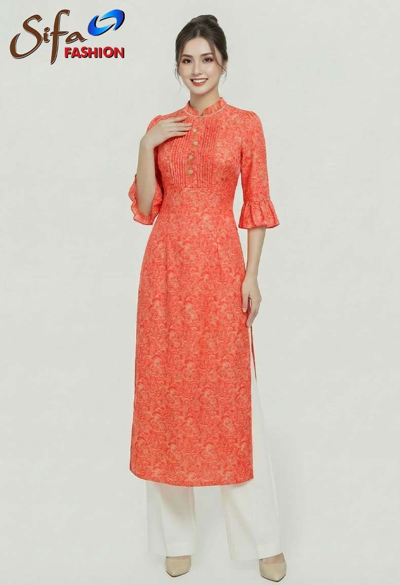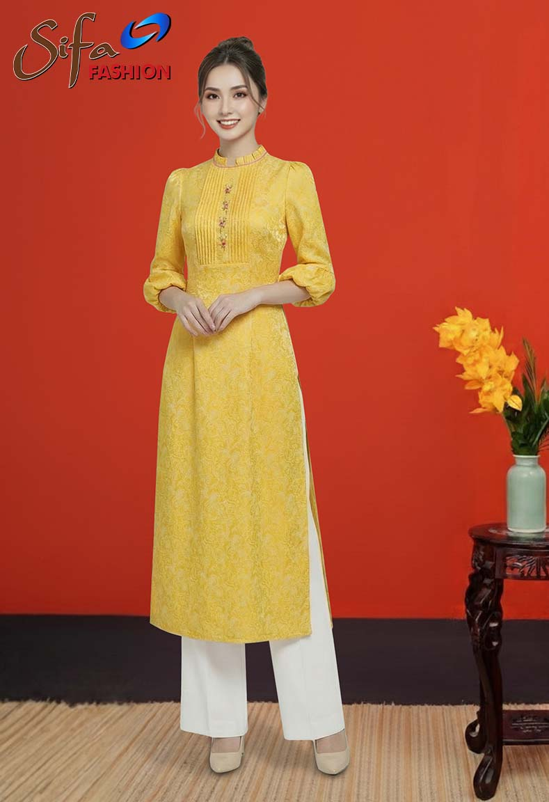 MÔ TẢ SẢN PHẨM: Áo dài cách tân cổ tròn bèo, tay dáng lồng đền, thêu hoa nhỏ xinh.