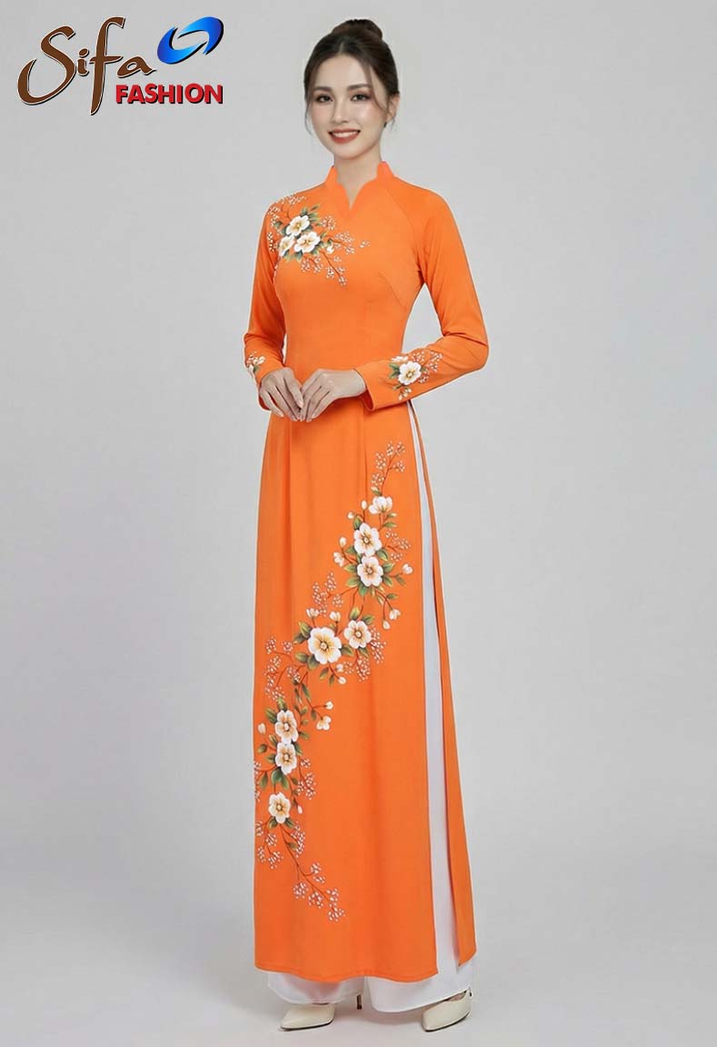 MÔ TẢ SẢN PHẨM: Áo dài cổ tim lượn, vẽ hoa nghệ thuật kết hợp dán đá.