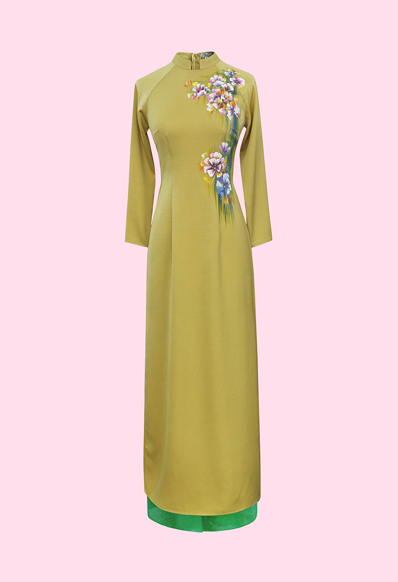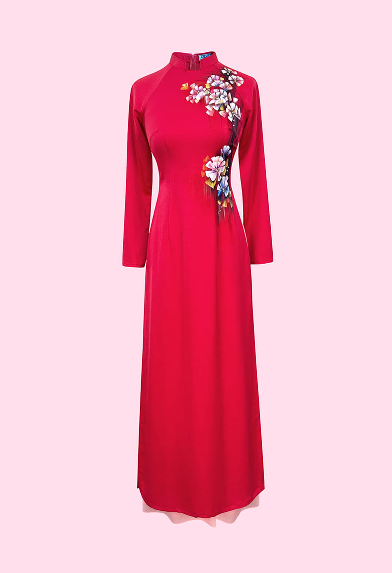 MÔ TẢ SẢN PHẨM: Áo dài cổ truyền thống vuông, vẽ hoa nghệ thuật kết hợp đính pha lê.