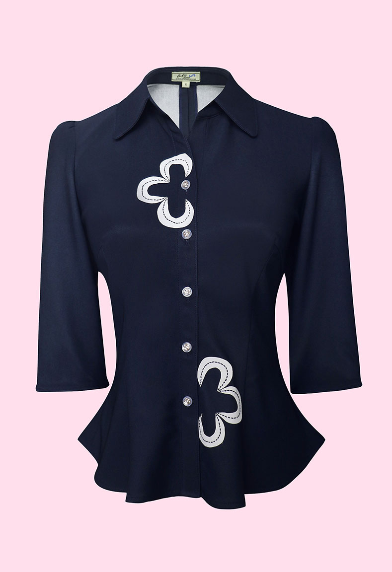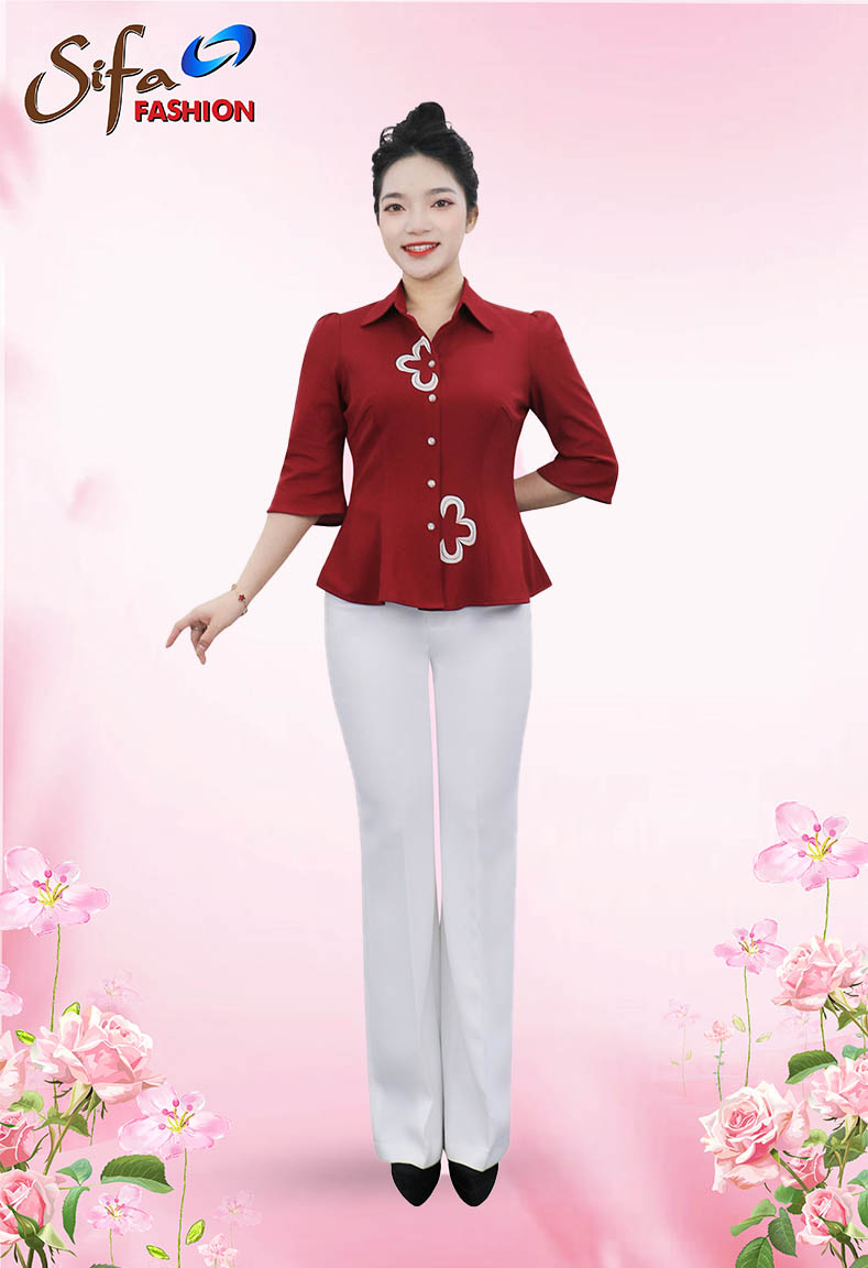 MÔ TẢ SẢN PHẨM: Áo sơ mi tay lỡ loe, lai xòe, đắp hoa nghệ thuật.