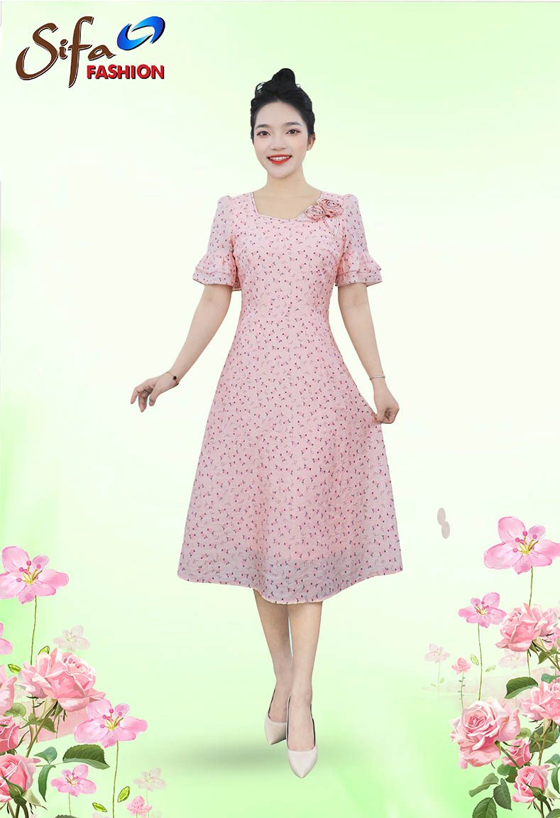 MÔ TẢ SẢN PHẨM: Đầm cổ vuông tim kết hoa nghệ thuật, dáng xòe, tay ngắn bèo 2 tầng.